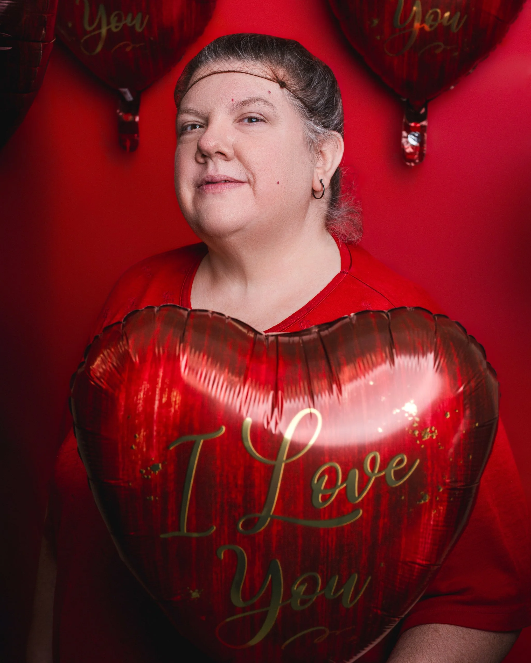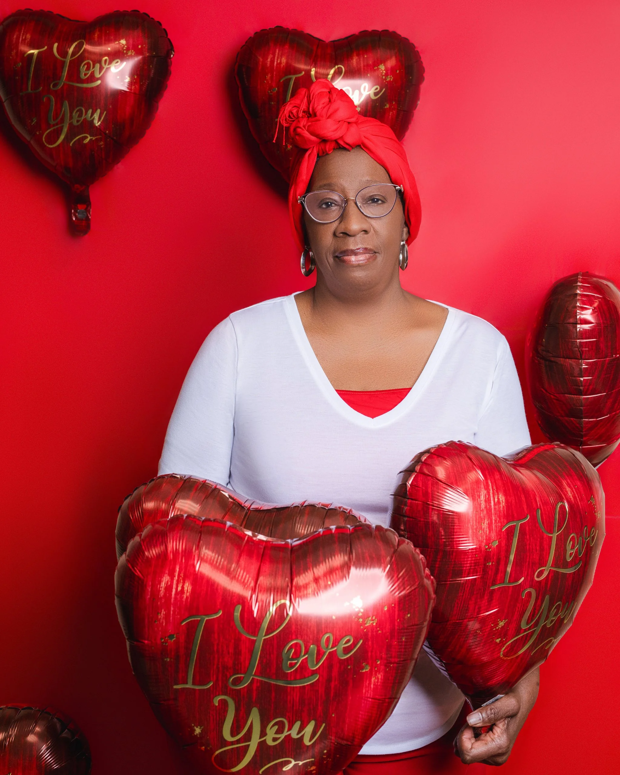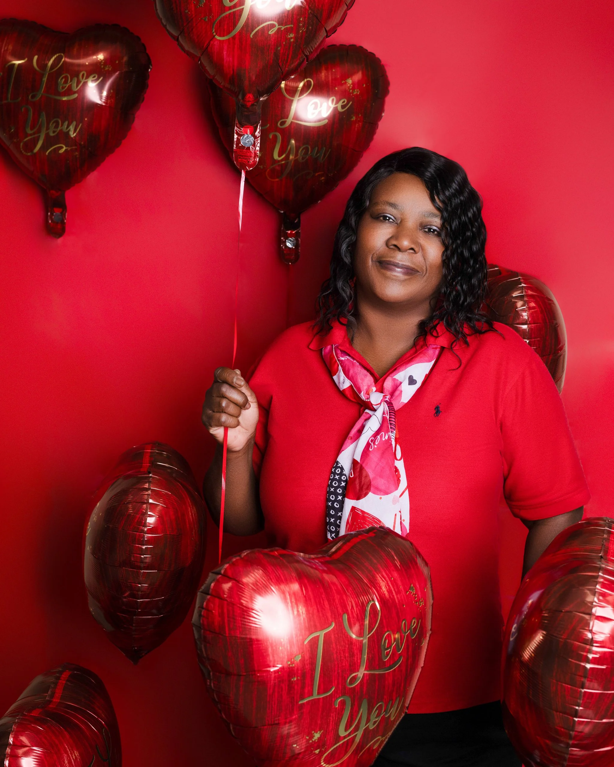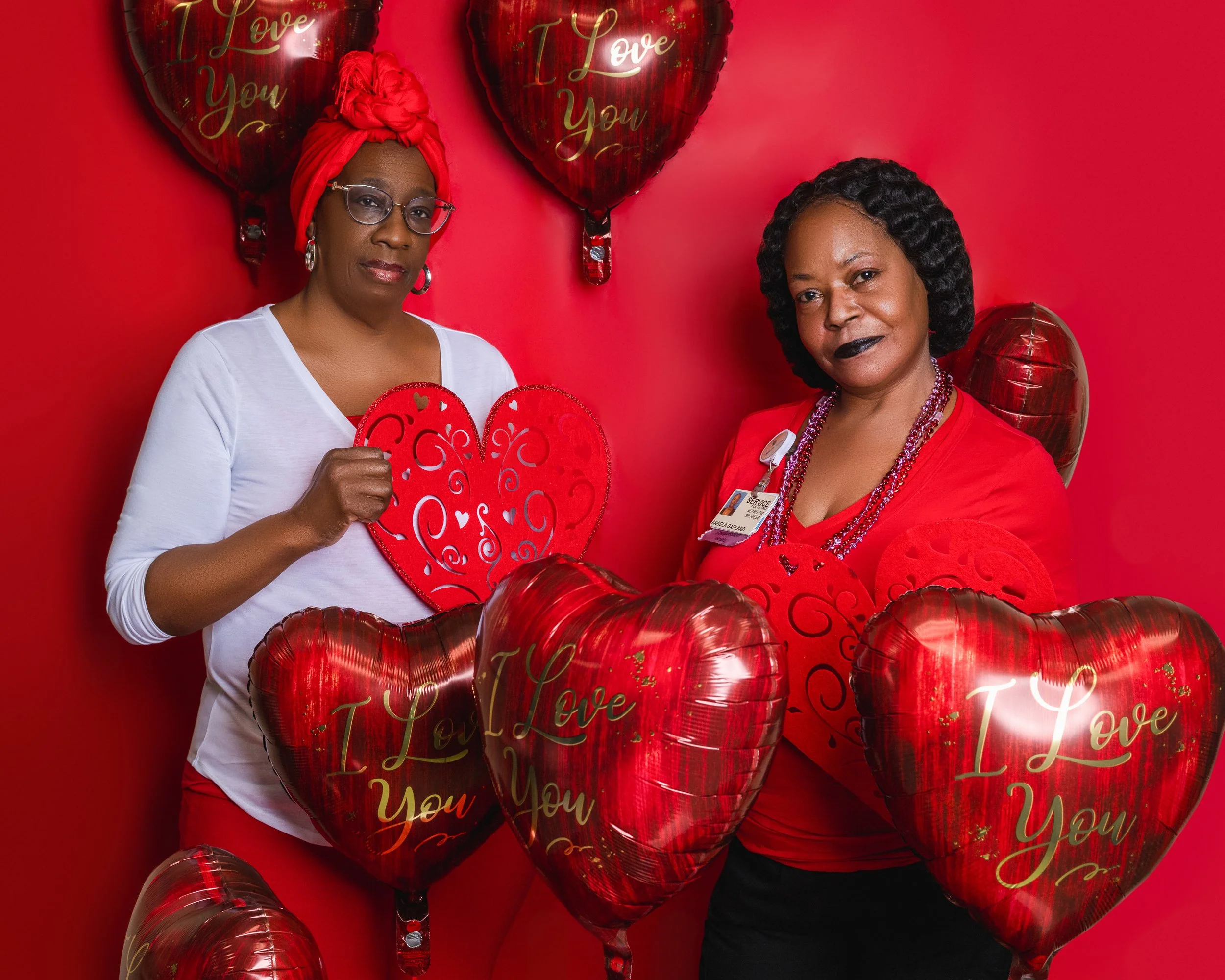 Two women standing against a red background holding heart-shaped balloons and decorations, with the text 'I Love You' on the balloons. Both are dressed in red and white attire.