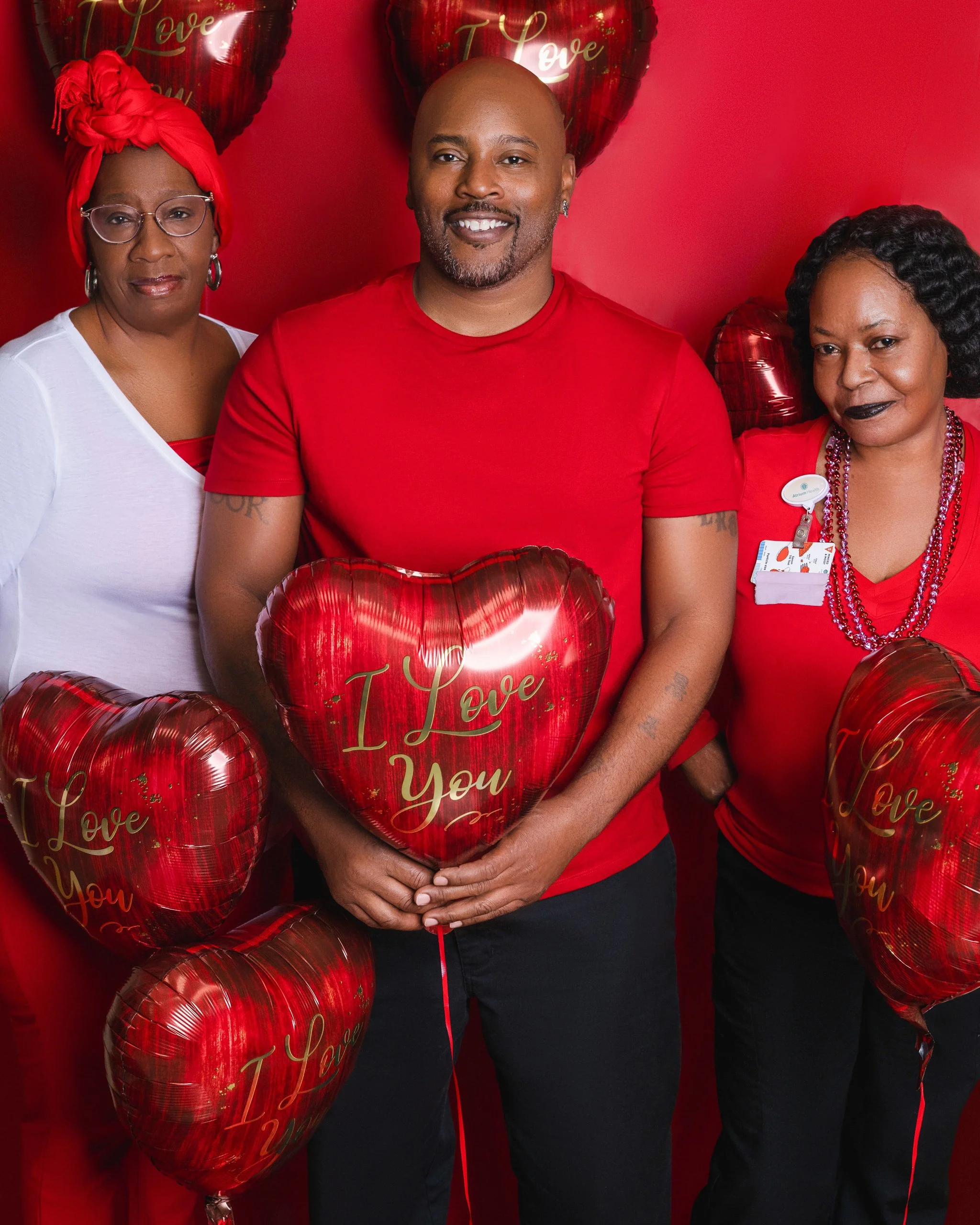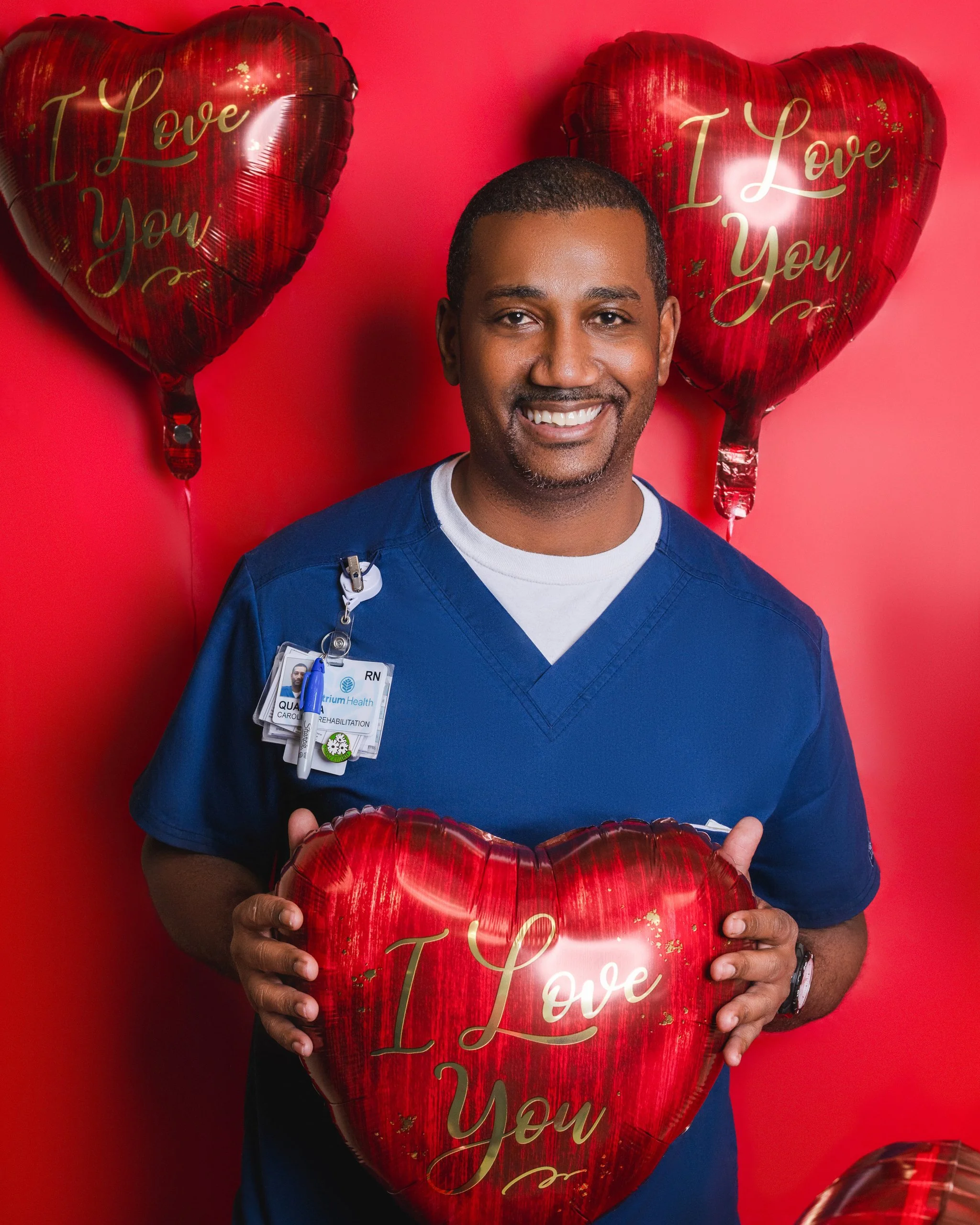 Smiling man in blue scrubs holding heart-shaped balloon with 'I Love You' message, surrounded by similar balloons against a red background.