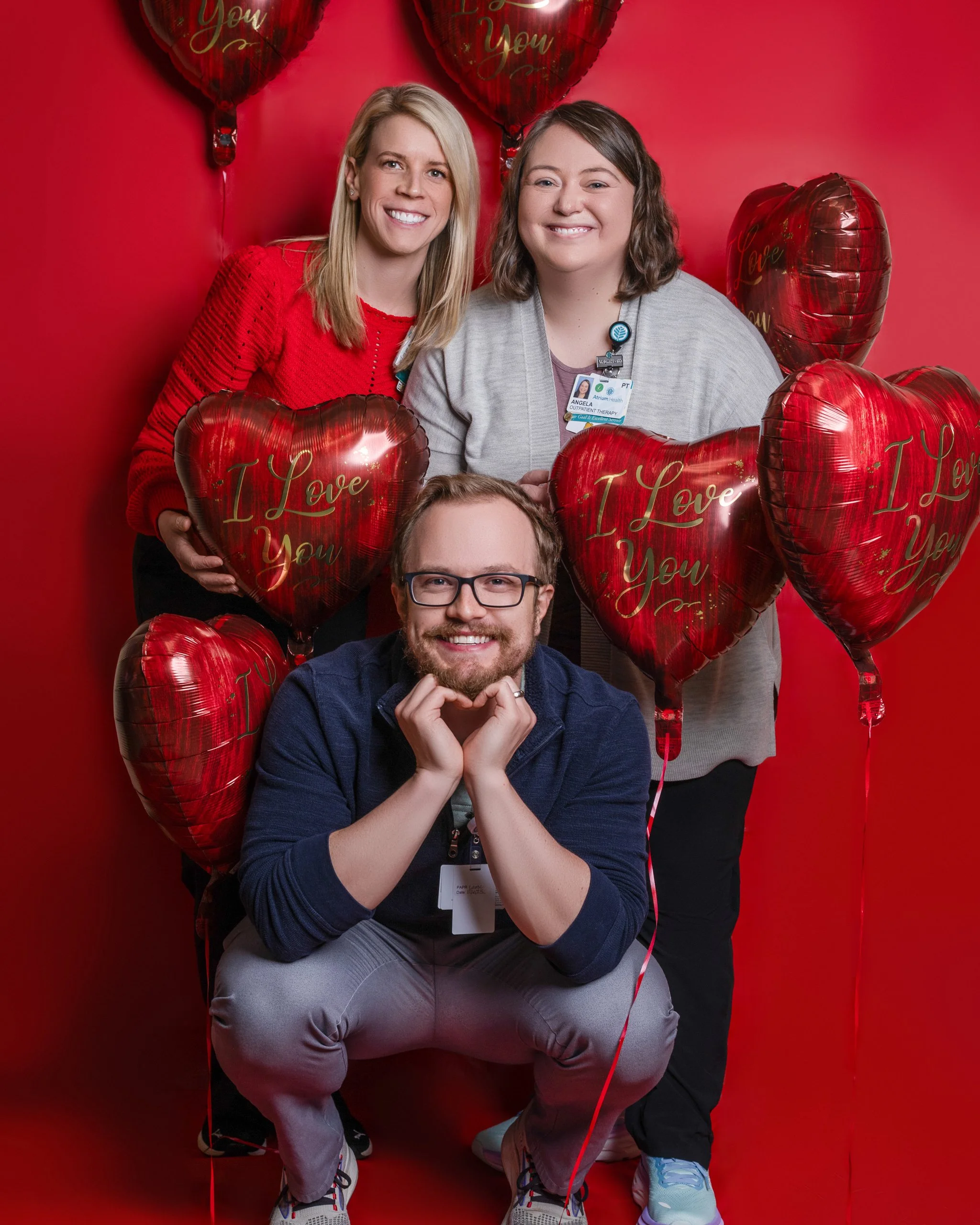 Three people posing in front of a red background with heart-shaped balloons that say 'I Love You.' The group is smiling, with two standing and one crouching in front.