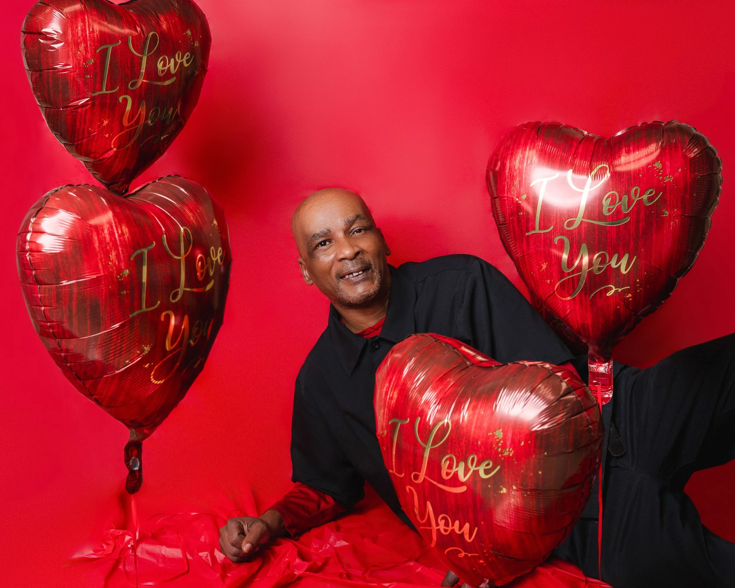 Man in red shirt holding heart-shaped balloons with "I Love You" lettering against a red background.
